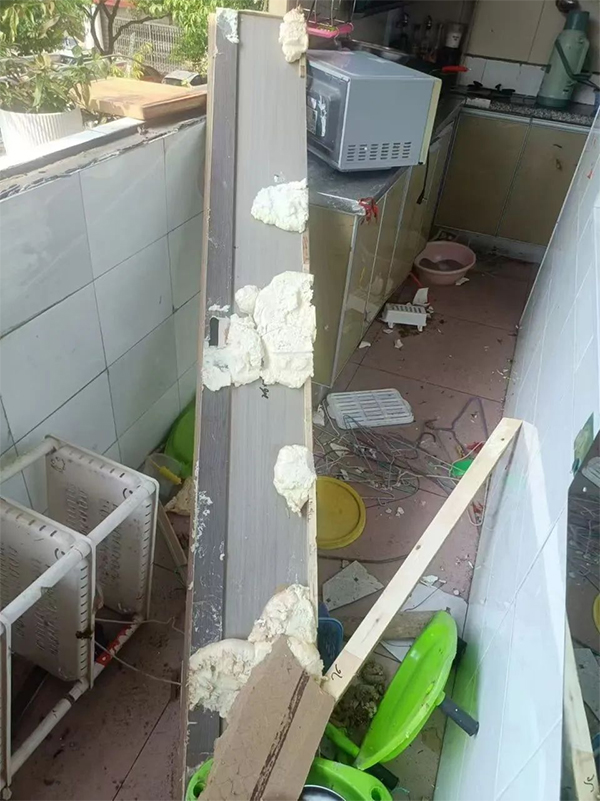 這次爆炸不僅造成了嚴(yán)重的家庭財(cái)產(chǎn)損失——陽臺(tái)的窗戶被炸飛,家中的木門和入戶的鐵門也遭到了嚴(yán)重破壞。幸運(yùn)的是,家中的兩個(gè)孩子并未受到嚴(yán)重傷害。