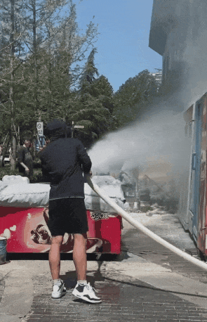 但幾瓶滅火器用完后,火勢(shì)仍顯頑強(qiáng),并未完全熄滅